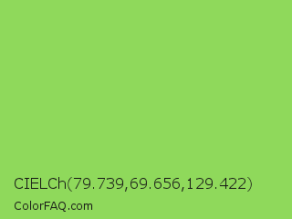 CIELCh 79.739,69.656,129.422 Color is a normal green color and the nearest color is Kiwi #8ee53f. Hex code #8fd95b and RGB value is rgb(143,217,91). In RGB color space, this color is composed of 56% red, 85% green, 36% blue, In CMYK color space, this color is composed of 34% cyan, 0% magenta, 58% yellow , 15% black , In HSL color space, this color has a hue angle of 95° , 62% saturation and 60% lightness.