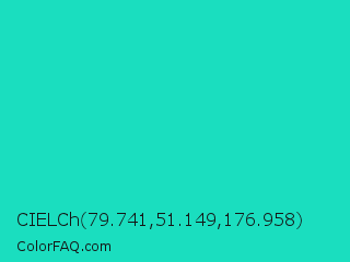 CIELCh 79.741,51.149,176.958 Color is a normal cyan color and the nearest color is Turquoise PWG #30d5c8. Hex code #1adebf and RGB value is rgb(26,222,191). In RGB color space, this color is composed of 10% red, 87% green, 75% blue, In CMYK color space, this color is composed of 88% cyan, 0% magenta, 14% yellow , 13% black , In HSL color space, this color has a hue angle of 171° , 79% saturation and 49% lightness.