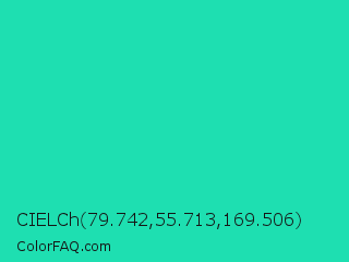 CIELCh 79.742,55.713,169.506 Color is a normal cyan color and the nearest color is Turquoise PWG #30d5c8. Hex code #1edfb1 and RGB value is rgb(30,223,177). In RGB color space, this color is composed of 12% red, 87% green, 69% blue, In CMYK color space, this color is composed of 87% cyan, 0% magenta, 21% yellow , 13% black , In HSL color space, this color has a hue angle of 166° , 76% saturation and 50% lightness.