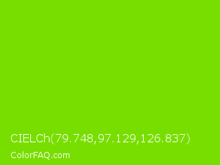 CIELCh 79.748,97.129,126.837 Color is a normal green color and the nearest color is Alien Armpit #84de02. Hex code #78de00 and RGB value is rgb(120,222,0). In RGB color space, this color is composed of 47% red, 87% green, 0% blue, In CMYK color space, this color is composed of 46% cyan, 0% magenta, 100% yellow , 13% black , In HSL color space, this color has a hue angle of 88° , 100% saturation and 44% lightness.