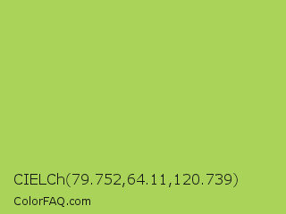 CIELCh 79.752,64.11,120.739 Color is a normal green color and the nearest color is Conifer #acdd4d. Hex code #a9d459 and RGB value is rgb(169,212,89). In RGB color space, this color is composed of 66% red, 83% green, 35% blue, In CMYK color space, this color is composed of 20% cyan, 0% magenta, 58% yellow , 17% black , In HSL color space, this color has a hue angle of 81° , 59% saturation and 59% lightness.