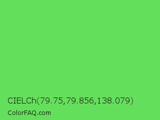 CIELCh 79.75,79.856,138.079 Color is a light green color and the nearest color is Mantis #74c365. Hex code #64df5b and RGB value is rgb(100,223,91). In RGB color space, this color is composed of 39% red, 87% green, 36% blue, In CMYK color space, this color is composed of 55% cyan, 0% magenta, 59% yellow , 13% black , In HSL color space, this color has a hue angle of 116° , 67% saturation and 62% lightness.