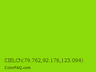 CIELCh 79.762,92.176,123.094 Color is a normal green color and the nearest color is Alien Armpit #84de02. Hex code #8cdb0a and RGB value is rgb(140,219,10). In RGB color space, this color is composed of 55% red, 86% green, 4% blue, In CMYK color space, this color is composed of 36% cyan, 0% magenta, 95% yellow , 14% black , In HSL color space, this color has a hue angle of 83° , 91% saturation and 45% lightness.