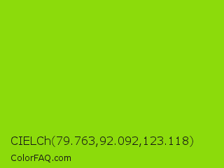 CIELCh 79.763,92.092,123.118 Color is a normal green color and the nearest color is Alien Armpit #84de02. Hex code #8cdb0b and RGB value is rgb(140,219,11). In RGB color space, this color is composed of 55% red, 86% green, 4% blue, In CMYK color space, this color is composed of 36% cyan, 0% magenta, 95% yellow , 14% black , In HSL color space, this color has a hue angle of 83° , 90% saturation and 45% lightness.