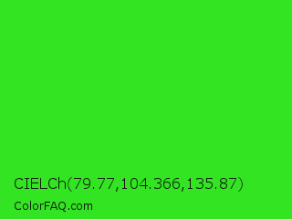 CIELCh 79.77,104.366,135.87 Color is a normal green color and the nearest color is Lime Green #32cd32. Hex code #32e421 and RGB value is rgb(50,228,33). In RGB color space, this color is composed of 20% red, 89% green, 13% blue, In CMYK color space, this color is composed of 78% cyan, 0% magenta, 86% yellow , 11% black , In HSL color space, this color has a hue angle of 115° , 78% saturation and 51% lightness.