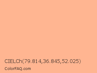 CIELCh 79.814,36.845,52.025 Color is a light orange color and the nearest color is Macaroni And Cheese #ffbd88. Hex code #ffb591 and RGB value is rgb(255,181,145). In RGB color space, this color is composed of 100% red, 71% green, 57% blue, In CMYK color space, this color is composed of 0% cyan, 29% magenta, 43% yellow , 0% black , In HSL color space, this color has a hue angle of 20° , 100% saturation and 78% lightness.