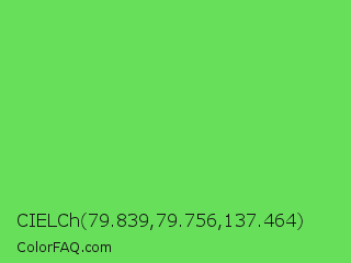 CIELCh 79.839,79.756,137.464 Color is a light green color and the nearest color is Mantis #74c365. Hex code #67df5a and RGB value is rgb(103,223,90). In RGB color space, this color is composed of 40% red, 87% green, 35% blue, In CMYK color space, this color is composed of 54% cyan, 0% magenta, 60% yellow , 13% black , In HSL color space, this color has a hue angle of 114° , 68% saturation and 61% lightness.