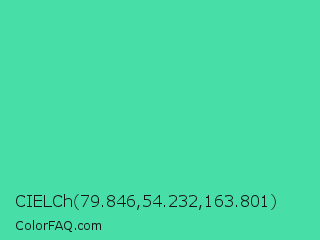 CIELCh 79.846,54.232,163.801 Color is a normal green color and the nearest color is Eucalyptus #44d7a8. Hex code #47dea8 and RGB value is rgb(71,222,168). In RGB color space, this color is composed of 28% red, 87% green, 66% blue, In CMYK color space, this color is composed of 68% cyan, 0% magenta, 24% yellow , 13% black , In HSL color space, this color has a hue angle of 159° , 70% saturation and 57% lightness.