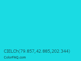 CIELCh 79.857,42.885,202.344 Color is a normal cyan color and the nearest color is Bright Turquoise #08e8de. Hex code #1adbe3 and RGB value is rgb(26,219,227). In RGB color space, this color is composed of 10% red, 86% green, 89% blue, In CMYK color space, this color is composed of 89% cyan, 4% magenta, 0% yellow , 11% black , In HSL color space, this color has a hue angle of 182° , 79% saturation and 50% lightness.
