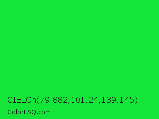 CIELCh 79.882,101.24,139.145 Color is a normal green color and the nearest color is Malachite #0bda51. Hex code #13e539 and RGB value is rgb(19,229,57). In RGB color space, this color is composed of 7% red, 90% green, 22% blue, In CMYK color space, this color is composed of 92% cyan, 0% magenta, 75% yellow , 10% black , In HSL color space, this color has a hue angle of 131° , 85% saturation and 49% lightness.