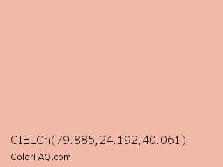 CIELCh 79.885,24.192,40.061 Color is a very light red color and the nearest color is Melon Crayola #febaad. Hex code #f2b9aa and RGB value is rgb(242,185,170). In RGB color space, this color is composed of 95% red, 73% green, 67% blue, In CMYK color space, this color is composed of 0% cyan, 24% magenta, 30% yellow , 5% black , In HSL color space, this color has a hue angle of 13° , 73% saturation and 81% lightness.