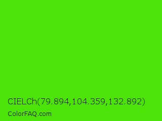 CIELCh 79.894,104.359,132.892 Color is a normal green color and the nearest color is Harlequin Green #46cb18. Hex code #4ce309 and RGB value is rgb(76,227,9). In RGB color space, this color is composed of 30% red, 89% green, 4% blue, In CMYK color space, this color is composed of 67% cyan, 0% magenta, 96% yellow , 11% black , In HSL color space, this color has a hue angle of 102° , 92% saturation and 46% lightness.