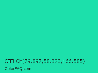 CIELCh 79.897,58.323,166.585 Color is a normal cyan color and the nearest color is Shamrock #33cc99. Hex code #1ce0ab and RGB value is rgb(28,224,171). In RGB color space, this color is composed of 11% red, 88% green, 67% blue, In CMYK color space, this color is composed of 88% cyan, 0% magenta, 24% yellow , 12% black , In HSL color space, this color has a hue angle of 164° , 78% saturation and 49% lightness.