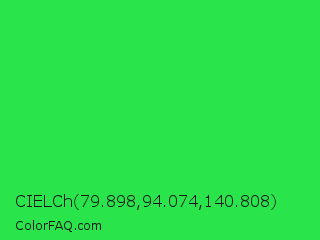 CIELCh 79.898,94.074,140.808 Color is a normal green color and the nearest color is Malachite #0bda51. Hex code #2ae44c and RGB value is rgb(42,228,76). In RGB color space, this color is composed of 16% red, 89% green, 30% blue, In CMYK color space, this color is composed of 82% cyan, 0% magenta, 67% yellow , 11% black , In HSL color space, this color has a hue angle of 131° , 78% saturation and 53% lightness.