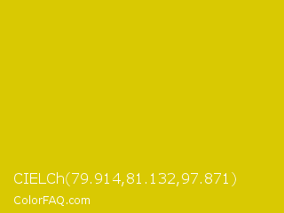 CIELCh 79.914,81.132,97.871 Color is a normal yellow color and the nearest color is Citrine #e4d00a. Hex code #d9c902 and RGB value is rgb(217,201,2). In RGB color space, this color is composed of 85% red, 79% green, 1% blue, In CMYK color space, this color is composed of 0% cyan, 7% magenta, 99% yellow , 15% black , In HSL color space, this color has a hue angle of 56° , 98% saturation and 43% lightness.