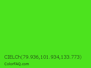 CIELCh 79.936,101.934,133.773 Color is a normal green color and the nearest color is Harlequin Green #46cb18. Hex code #4ce31e and RGB value is rgb(76,227,30). In RGB color space, this color is composed of 30% red, 89% green, 12% blue, In CMYK color space, this color is composed of 67% cyan, 0% magenta, 87% yellow , 11% black , In HSL color space, this color has a hue angle of 106° , 78% saturation and 50% lightness.