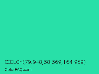 CIELCh 79.948,58.569,164.959 Color is a normal green color and the nearest color is Shamrock #33cc99. Hex code #28e0a8 and RGB value is rgb(40,224,168). In RGB color space, this color is composed of 16% red, 88% green, 66% blue, In CMYK color space, this color is composed of 82% cyan, 0% magenta, 25% yellow , 12% black , In HSL color space, this color has a hue angle of 162° , 75% saturation and 52% lightness.