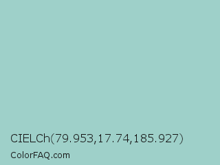 CIELCh 79.953,17.74,185.927 Color is a light cyan color and the nearest color is Sinbad #9fd7d3. Hex code #9ed0c9 and RGB value is rgb(158,208,201). In RGB color space, this color is composed of 62% red, 82% green, 79% blue, In CMYK color space, this color is composed of 24% cyan, 0% magenta, 3% yellow , 18% black , In HSL color space, this color has a hue angle of 172° , 35% saturation and 72% lightness.