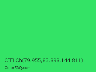 CIELCh 79.955,83.898,144.811 Color is a normal green color and the nearest color is UFO Green #3cd070. Hex code #33e366 and RGB value is rgb(51,227,102). In RGB color space, this color is composed of 20% red, 89% green, 40% blue, In CMYK color space, this color is composed of 78% cyan, 0% magenta, 55% yellow , 11% black , In HSL color space, this color has a hue angle of 137° , 76% saturation and 55% lightness.