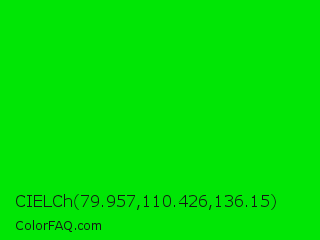 CIELCh 79.957,110.426,136.15 Color is a normal green color and the nearest color is Green #00ff00. Hex code #00e605 and RGB value is rgb(0,230,5). In RGB color space, this color is composed of 0% red, 90% green, 2% blue, In CMYK color space, this color is composed of 100% cyan, 0% magenta, 98% yellow , 10% black , In HSL color space, this color has a hue angle of 121° , 100% saturation and 45% lightness.