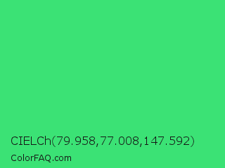 CIELCh 79.958,77.008,147.592 Color is a normal green color and the nearest color is UFO Green #3cd070. Hex code #3be275 and RGB value is rgb(59,226,117). In RGB color space, this color is composed of 23% red, 89% green, 46% blue, In CMYK color space, this color is composed of 74% cyan, 0% magenta, 48% yellow , 11% black , In HSL color space, this color has a hue angle of 141° , 74% saturation and 56% lightness.