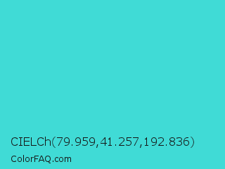 CIELCh 79.959,41.257,192.836 Color is a normal cyan color and the nearest color is Turquoise #40e0d0. Hex code #40dbd6 and RGB value is rgb(64,219,214). In RGB color space, this color is composed of 25% red, 86% green, 84% blue, In CMYK color space, this color is composed of 71% cyan, 0% magenta, 2% yellow , 14% black , In HSL color space, this color has a hue angle of 178° , 68% saturation and 55% lightness.