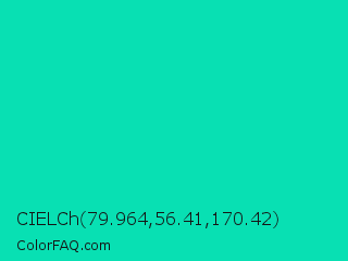 CIELCh 79.964,56.41,170.42 Color is a normal cyan color and the nearest color is Amazonite #00c4b0. Hex code #08e0b3 and RGB value is rgb(8,224,179). In RGB color space, this color is composed of 3% red, 88% green, 70% blue, In CMYK color space, this color is composed of 96% cyan, 0% magenta, 20% yellow , 12% black , In HSL color space, this color has a hue angle of 168° , 93% saturation and 45% lightness.