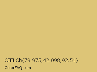 CIELCh 79.975,42.098,92.51 Color is a light yellow color and the nearest color is Apache #dfbe6f. Hex code #ddc577 and RGB value is rgb(221,197,119). In RGB color space, this color is composed of 87% red, 77% green, 47% blue, In CMYK color space, this color is composed of 0% cyan, 11% magenta, 46% yellow , 13% black , In HSL color space, this color has a hue angle of 46° , 60% saturation and 67% lightness.