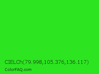 CIELCh 79.998,105.376,136.117 Color is a normal green color and the nearest color is Lime Green #32cd32. Hex code #2ce520 and RGB value is rgb(44,229,32). In RGB color space, this color is composed of 17% red, 90% green, 13% blue, In CMYK color space, this color is composed of 81% cyan, 0% magenta, 86% yellow , 10% black , In HSL color space, this color has a hue angle of 116° , 79% saturation and 51% lightness.