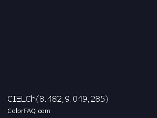 CIELCh 8.482,9.049,285 Color is a very dark blue color and the nearest color is Mirage #161928. Hex code #151824 and RGB value is rgb(21,24,36). In RGB color space, this color is composed of 8% red, 9% green, 14% blue, In CMYK color space, this color is composed of 42% cyan, 33% magenta, 0% yellow , 86% black , In HSL color space, this color has a hue angle of 228° , 26% saturation and 11% lightness.