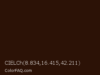 CIELCh 8.834,16.415,42.211 Color is a very dark orange color and the nearest color is Zinnwaldite Brown #2c1608. Hex code #2c1206 and RGB value is rgb(44,18,6). In RGB color space, this color is composed of 17% red, 7% green, 2% blue, In CMYK color space, this color is composed of 0% cyan, 59% magenta, 86% yellow , 83% black , In HSL color space, this color has a hue angle of 19° , 76% saturation and 10% lightness.