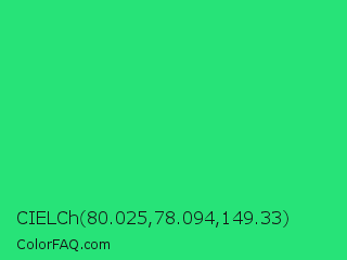 CIELCh 80.025,78.094,149.33 Color is a normal green color and the nearest color is UFO Green #3cd070. Hex code #27e378 and RGB value is rgb(39,227,120). In RGB color space, this color is composed of 15% red, 89% green, 47% blue, In CMYK color space, this color is composed of 83% cyan, 0% magenta, 47% yellow , 11% black , In HSL color space, this color has a hue angle of 146° , 77% saturation and 52% lightness.