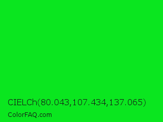 CIELCh 80.043,107.434,137.065 Color is a normal green color and the nearest color is Vivid Malachite #00cc33. Hex code #0ae61f and RGB value is rgb(10,230,31). In RGB color space, this color is composed of 4% red, 90% green, 12% blue, In CMYK color space, this color is composed of 96% cyan, 0% magenta, 87% yellow , 10% black , In HSL color space, this color has a hue angle of 126° , 92% saturation and 47% lightness.