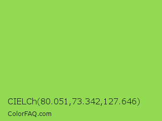 CIELCh 80.051,73.342,127.646 Color is a normal green color and the nearest color is Kiwi #8ee53f. Hex code #91da52 and RGB value is rgb(145,218,82). In RGB color space, this color is composed of 57% red, 85% green, 32% blue, In CMYK color space, this color is composed of 33% cyan, 0% magenta, 62% yellow , 15% black , In HSL color space, this color has a hue angle of 92° , 65% saturation and 59% lightness.