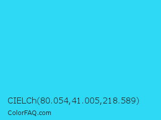 CIELCh 80.054,41.005,218.589 Color is a normal cyan color and the nearest color is Loeen #15f2fd. Hex code #2dd9f5 and RGB value is rgb(45,217,245). In RGB color space, this color is composed of 18% red, 85% green, 96% blue, In CMYK color space, this color is composed of 82% cyan, 11% magenta, 0% yellow , 4% black , In HSL color space, this color has a hue angle of 188° , 91% saturation and 57% lightness.