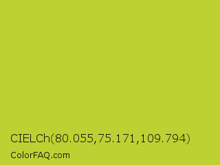 CIELCh 80.055,75.171,109.794 Color is a normal yellow color and the nearest color is Key Lime Pie #bfc921. Hex code #bed132 and RGB value is rgb(190,209,50). In RGB color space, this color is composed of 75% red, 82% green, 20% blue, In CMYK color space, this color is composed of 9% cyan, 0% magenta, 76% yellow , 18% black , In HSL color space, this color has a hue angle of 67° , 63% saturation and 51% lightness.
