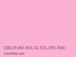 CIELCh 80.063,32.521,350.006 Color is a very light rose color and the nearest color is Lavender Pink #fbaed2. Hex code #fcb1d2 and RGB value is rgb(252,177,210). In RGB color space, this color is composed of 99% red, 69% green, 82% blue, In CMYK color space, this color is composed of 0% cyan, 30% magenta, 17% yellow , 1% black , In HSL color space, this color has a hue angle of 334° , 93% saturation and 84% lightness.
