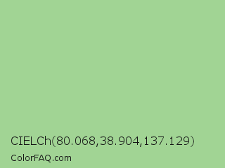 CIELCh 80.068,38.904,137.129 Color is a light green color and the nearest color is Feijoa #9fdd8c. Hex code #a1d494 and RGB value is rgb(161,212,148). In RGB color space, this color is composed of 63% red, 83% green, 58% blue, In CMYK color space, this color is composed of 24% cyan, 0% magenta, 30% yellow , 17% black , In HSL color space, this color has a hue angle of 108° , 43% saturation and 71% lightness.