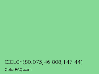 CIELCh 80.075,46.808,147.44 Color is a light green color and the nearest color is Light Green #90ee90. Hex code #85d996 and RGB value is rgb(133,217,150). In RGB color space, this color is composed of 52% red, 85% green, 59% blue, In CMYK color space, this color is composed of 39% cyan, 0% magenta, 31% yellow , 15% black , In HSL color space, this color has a hue angle of 132° , 53% saturation and 69% lightness.