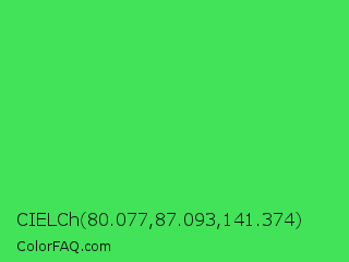 CIELCh 80.077,87.093,141.374 Color is a normal green color and the nearest color is UFO Green #3cd070. Hex code #42e359 and RGB value is rgb(66,227,89). In RGB color space, this color is composed of 26% red, 89% green, 35% blue, In CMYK color space, this color is composed of 71% cyan, 0% magenta, 61% yellow , 11% black , In HSL color space, this color has a hue angle of 129° , 74% saturation and 57% lightness.