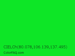 CIELCh 80.078,106.139,137.495 Color is a normal green color and the nearest color is Vivid Malachite #00cc33. Hex code #0de626 and RGB value is rgb(13,230,38). In RGB color space, this color is composed of 5% red, 90% green, 15% blue, In CMYK color space, this color is composed of 94% cyan, 0% magenta, 83% yellow , 10% black , In HSL color space, this color has a hue angle of 127° , 89% saturation and 48% lightness.
