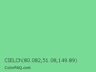 CIELCh 80.082,51.08,149.89 Color is a light green color and the nearest color is De York #7ac488. Hex code #78db95 and RGB value is rgb(120,219,149). In RGB color space, this color is composed of 47% red, 86% green, 58% blue, In CMYK color space, this color is composed of 45% cyan, 0% magenta, 32% yellow , 14% black , In HSL color space, this color has a hue angle of 138° , 58% saturation and 66% lightness.