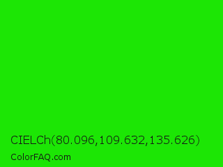 CIELCh 80.096,109.632,135.626 Color is a normal green color and the nearest color is Green #00ff00. Hex code #1ce605 and RGB value is rgb(28,230,5). In RGB color space, this color is composed of 11% red, 90% green, 2% blue, In CMYK color space, this color is composed of 88% cyan, 0% magenta, 98% yellow , 10% black , In HSL color space, this color has a hue angle of 114° , 96% saturation and 46% lightness.