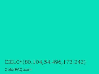 CIELCh 80.104,54.496,173.243 Color is a normal cyan color and the nearest color is Robins Egg Blue #00cccc. Hex code #08e0b9 and RGB value is rgb(8,224,185). In RGB color space, this color is composed of 3% red, 88% green, 73% blue, In CMYK color space, this color is composed of 96% cyan, 0% magenta, 17% yellow , 12% black , In HSL color space, this color has a hue angle of 169° , 93% saturation and 45% lightness.