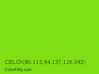 CIELCh 80.113,94.137,126.043 Color is a normal green color and the nearest color is Alien Armpit #84de02. Hex code #80de14 and RGB value is rgb(128,222,20). In RGB color space, this color is composed of 50% red, 87% green, 8% blue, In CMYK color space, this color is composed of 42% cyan, 0% magenta, 91% yellow , 13% black , In HSL color space, this color has a hue angle of 88° , 83% saturation and 47% lightness.