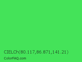 CIELCh 80.117,86.871,141.21 Color is a normal green color and the nearest color is UFO Green #3cd070. Hex code #44e359 and RGB value is rgb(68,227,89). In RGB color space, this color is composed of 27% red, 89% green, 35% blue, In CMYK color space, this color is composed of 70% cyan, 0% magenta, 61% yellow , 11% black , In HSL color space, this color has a hue angle of 128° , 74% saturation and 58% lightness.