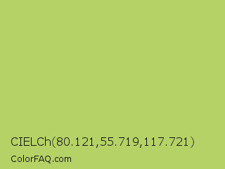 CIELCh 80.121,55.719,117.721 Color is a light lime color and the nearest color is Wild Willow #b9c46a. Hex code #b5d267 and RGB value is rgb(181,210,103). In RGB color space, this color is composed of 71% red, 82% green, 40% blue, In CMYK color space, this color is composed of 14% cyan, 0% magenta, 51% yellow , 18% black , In HSL color space, this color has a hue angle of 76° , 54% saturation and 61% lightness.