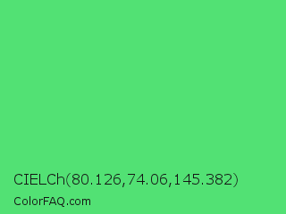 CIELCh 80.126,74.06,145.382 Color is a normal green color and the nearest color is Emerald #50c878. Hex code #52e174 and RGB value is rgb(82,225,116). In RGB color space, this color is composed of 32% red, 88% green, 45% blue, In CMYK color space, this color is composed of 64% cyan, 0% magenta, 48% yellow , 12% black , In HSL color space, this color has a hue angle of 134° , 70% saturation and 60% lightness.