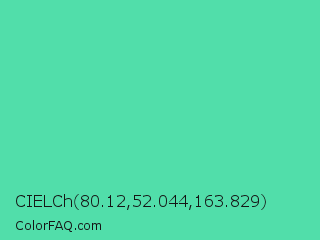 CIELCh 80.12,52.044,163.829 Color is a normal green color and the nearest color is Eucalyptus #44d7a8. Hex code #51deaa and RGB value is rgb(81,222,170). In RGB color space, this color is composed of 32% red, 87% green, 67% blue, In CMYK color space, this color is composed of 64% cyan, 0% magenta, 23% yellow , 13% black , In HSL color space, this color has a hue angle of 158° , 68% saturation and 59% lightness.
