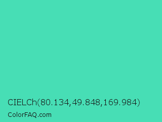 CIELCh 80.134,49.848,169.984 Color is a normal cyan color and the nearest color is Eucalyptus #44d7a8. Hex code #47deb5 and RGB value is rgb(71,222,181). In RGB color space, this color is composed of 28% red, 87% green, 71% blue, In CMYK color space, this color is composed of 68% cyan, 0% magenta, 18% yellow , 13% black , In HSL color space, this color has a hue angle of 164° , 70% saturation and 57% lightness.